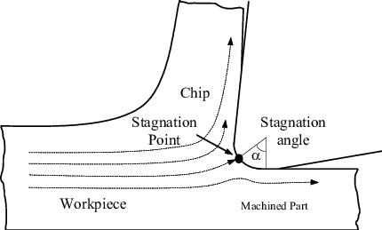 In Stagnation zone, work material does not flow as quickly as the work material flow in the rake and flank surface. Stagnation zone may either contain a dead metal that sticks on the top of the cutting edge, never sliding or may contain a stagnation point. The work material is being separated around the stagnation point either to form chip to become the new surface of the workpiece.