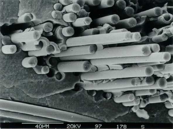 Fiber pull-out is one of the failure mechanisms in fiber-reinforced composite materials. Other forms of failure include delamination, intralaminar matrix cracking, longitudinal matrix splitting, fiber/matrix debonding, and fiber fracture. The cause of fiber pull-out and delamination is weak bonding. 12