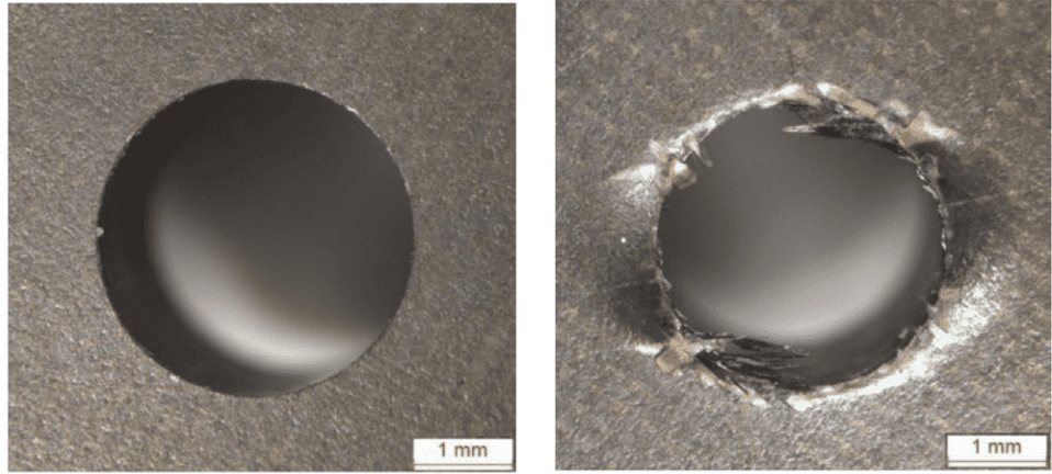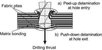 Main problem arises at the exit of the hole, experiencing severe delamination and flaking. The delamination is not axisymmetric, instead, it is produced in preference directions which are linked to fibre directions of the exit layer.