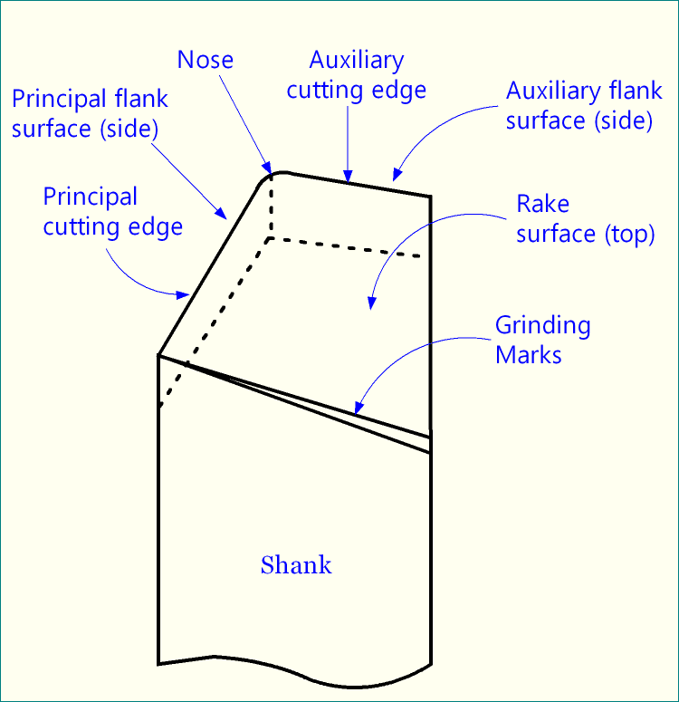 The figure below shows two cutting edges of single point turning tool. Single point cutting tools consists of only one cutting edge which can perform matal removal action at a time. Shaping, planing, slotting, boring tools are also single point tool.4
