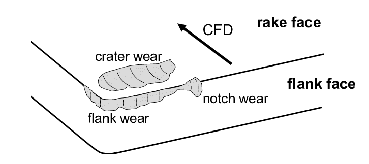 In failure analysis, workers will check condition at predetermined intervals and compare condition of insert with typical failure modes. Once the other failure modes have been corrected, measuring flank wear can then be the determinant of tool life.
