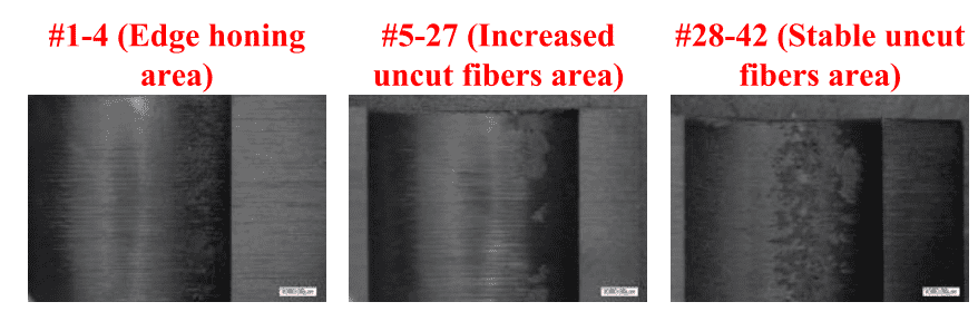 - Stable cut fibre area: Edge rounding can’t be superior to the uncut chip thickness and the uncut area will get stable.