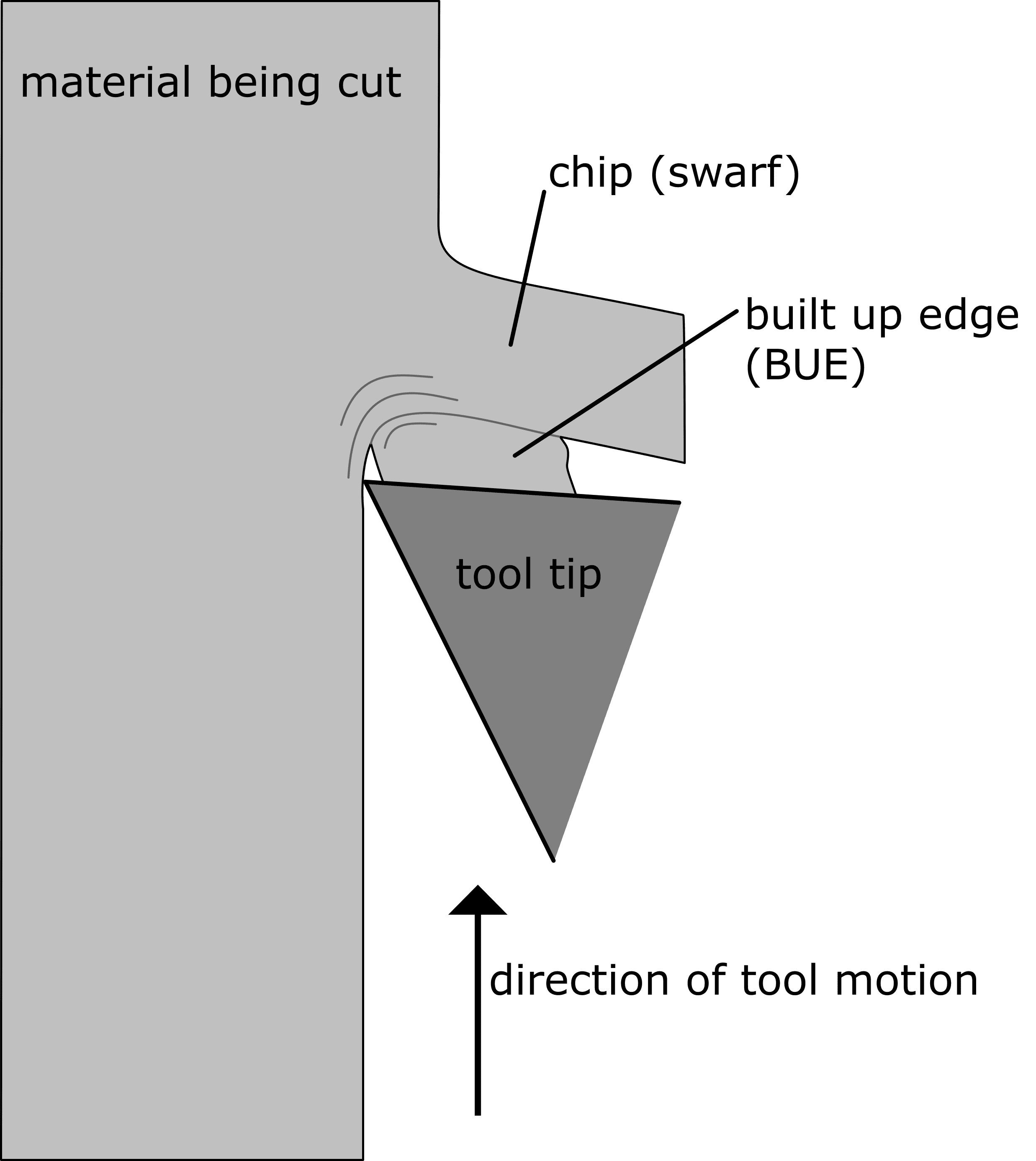 - Poor surface finish, since bits of the BUE eventually break off and stick to the workpiece. These bits tend to be problematic since, due to the work-hardening they underwent, they are very hard and so become abrasive.7
